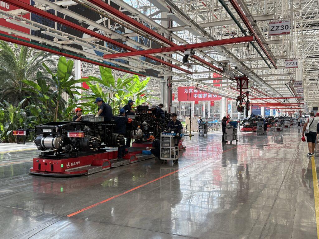Jak zkreslené mohou být představy o podobě výrobní linky. V tomto prostředí se montují kolové nakladače SANY. Na květiny nebo vodní plochy uprostřed výrobního závodu narazíte všude.